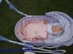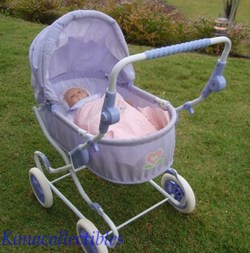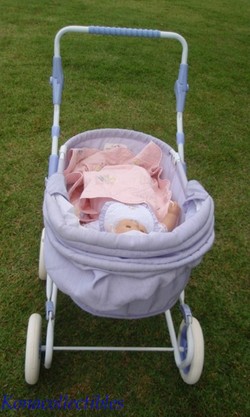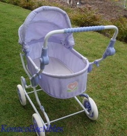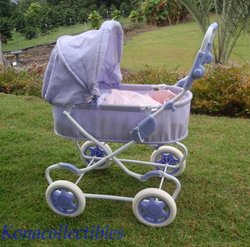 This classic pram has a lightweight metal frame that's covered with lavender shantung and lined with white taffeta. Features a convertible canopy and adjustable handle. The entire pram is collapsible for easy storage. W:17", H:32", L:31"