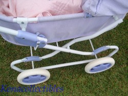 This pram is used but in good condition. There is a light pencil mark inside the basket on the white lining and the tires are a tiny bit worn.