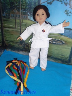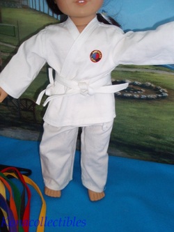 Here is a wonderful outfit from American Girl called Martial Arts. White gee with white belt and 9 additional colored belts for each level of acheivement your doll accomplishes in the sport. Hanger is included.