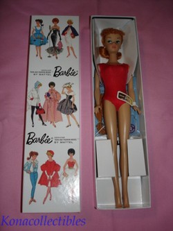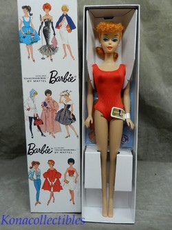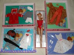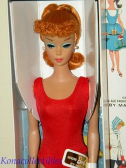 You are bidding on the amazing, well produced 'Lets Play Barbie' Repro Let�s Play Barbie Redhead Doll PLUS All Four Seasons Fashions.Redhead Reproduction NRFB comes with Certificate of Authenticity!Redhead Let�s Play Barbie� doll exudes a vintage vibe in her classic red tank swimsuit, faux pearl earrings and sunglasses. She comes in an early-60�s-inspired box. Inside the classic, reproduction box, is a reproduction metal stand, replica Fashion Booklet and classic red shoes! Way to go Mattel!You will also receive 4 separate outfits, never removed from replica original boxes. Here is a description of each outfit: Barbie Garden Party Fashion Repro #931 includes: white and pink floral print cotton dress is perfectly constructed and the graduated "pearl" necklace, white short gloves and white open toe pumps are a welcome edition for additional fashion play. Barbie Dinner at Eight Fashion Repro #946 includes: beautifully constructed orange taffeta pantsuit and sheer metallic gold on orange net hostess coat joined by a fabulous pair of golden platform slip-on heels. Barbie Resort Set Fashion Repro #96 includes: red sailor jacket with white trim, blue and white striped knit shirt, white shorts and white hat, charm bracelet and a fabulous pair of white and tan platform slip-on heels. Barbie Winter Holiday Fashion Repro #975. Includes: a beautifully constructed white pleather jacket, blue, white & black striped knit hooded shirt, black tights, plaid carry bag, red pleather gloves and white and tan platform slip-ons.