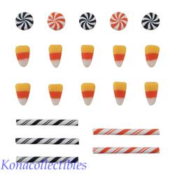 This package contains 20 pieces constructed of resin. Candy Corn measures 1/2 inches in height, sticks measure 1-1/2 inches in height and round candies measure 3/4 inches in diameter.