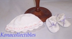 Here is a precious little knit sweater with Juliette cap and darling little booties from American Girl. Each peice is decorated with tiny satin ribbons in pink, spring green or lavender. A scallop design accents the edge of the sweater, cap and booties.