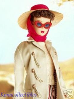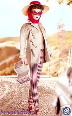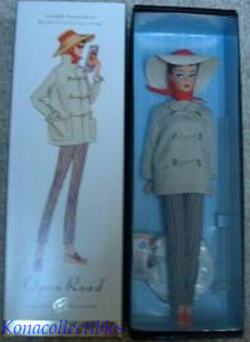 2004 Gold Label This darling vintage reproduction features a lovely brunette Ponytail doll wearing #985 Open Road fashion. Adorable fashion separates include slim slacks in a red/black/gray stripe with back zipper, a beige short-sleeved shell sweater with back closure, and a matching khaki car coat with toggle fasteners lined in a striped fabric. A straw cloth hat attached to a red chiffon scarf, a pair of red rimmed/blue lens sunglasses, and wedge sandals with red uppers complete Barbie dolls ensemble.