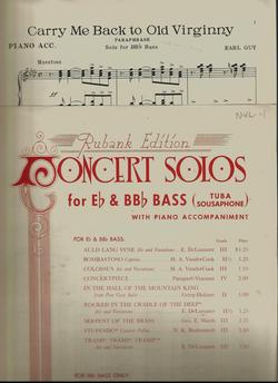 Carry Me Back to Old Virginny Paraphrase for BBb Bass (Tuba Sousaphone) with piano accompaniment Published by Rubank Arranged by Earl Guy Score with separate part UNUSED music store stock See my other listings for TONS more music!
