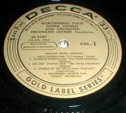 This is a vintage LP, on the gold DECCA records label, entitled Popular Opera Choruses, the Wurttemberg State Opera Chorus and Orchestra, Chorus of the Bavarian Radio and Munich Philharmonic Orchestra, Ferdinand Leitner, conductor.Both album jacket and vinyl are in excellent condition, the vinyl is NMINT. DL9797. Jazzbox46