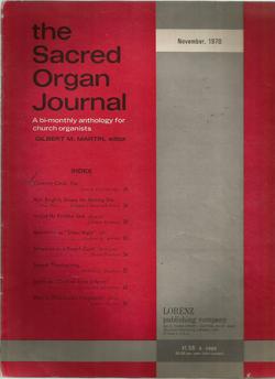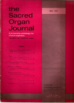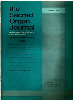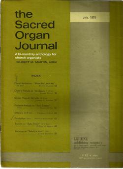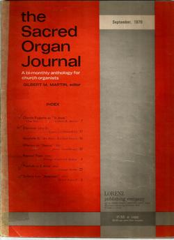 The Sacred Organ Journal A bi-monthly anthology for church organists Complete Set of 6 Issues from 1970 Gilbert M. Martin, Editor Lorenz Publishers Gently Used Pre-Owned Condition The spines of the books have been Taped to reinforce Minor Tape Repairs I have many years in sets currently this is from a massive collection of a 91 year old professional organist I have thousands of organ pieces listed currently in my Vendio store, so if you have any questions, please feel free to drop me a line