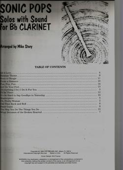 Sonic Pops Solos with Sound for Bb Clarinet Arranged by Mike Story published by Belwin Mills 16 pages this may have originally been sold with a cassette tape, but there is NO tape with this songbook Unused old store stock