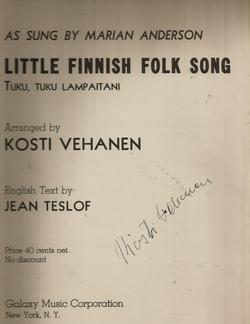 Little Finnish Song sung by Marian Anderson arranged & signed by Kosti Vehanen