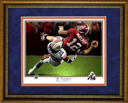 The Auburn Tigers of 2010 showed the world that no matter what they would not be denied victory. This print celebrates the Tigers comeback victory in Tuscaloosa in the Iron Bowl.This signed print by artist Larry Pitts is entitled, "The Comeback" and shows Bell as he throws McElroy to the ground thus ending the Tides chance at winning the game. This framed print measures 17 X 19 and is Professionally Framed in a 1 1/2" Walnut moulding with a brushed gold lip and is double matted in Navy Suede/orange with glass and backing. This print is brand new and is ready to hang.