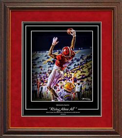 Brian Tinney celebrates this awesome receiver with his latest art print, "Rising Above All" Most Career Touchdowns by a Wide Receiver in SEC History This Professionally framed print measures approximately 17 x 20 with a 1 1/2" Dark cherry moulding with a gold lip and double mattes of crimson suede and black. It has glass and is ready to hang.