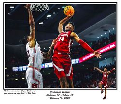ESPN ranks him as the No. 13 overall player and No. 4 small forward in the 2022 class and he shows why every time he steps on the court. This limited edition print celebrates one of the best players to ever where the Crimson and White and is entitled, "Crimson Slam"Alabama 77 Auburn 69 February 11, 2023