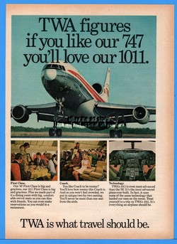 1973 TWA Airline 1011 Jumbo Jet First Class Dining Room Coach Technology Ad