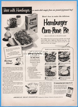 1950 American Meat Institute Hamburger Corn-Pone Pie recipe Mrs Wilbur Norman ad