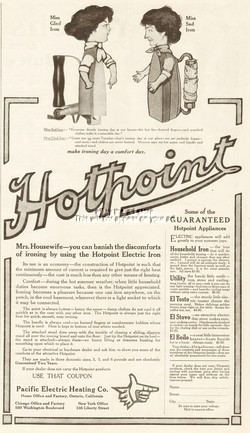 1911 Pacific Electric Heating Ontario CA Hotpoint Miss Glad & Miss Sad Iron Ad