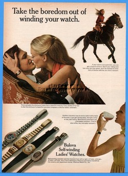 1973 Bulova Self Winding Ladies Watches Horse Ride Sexy Kiss Champagne Print Ad