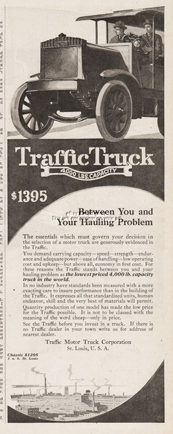1918 Traffic Motor Truck Corp St Louis MO 4,000 lb $1395 Hauling Problem Ad