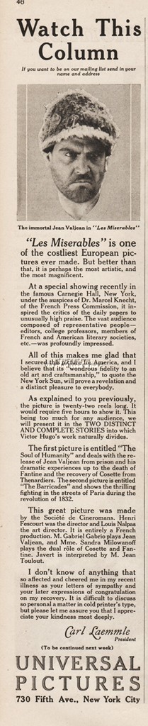1926 Universal Pictures Les Miserables Jean Valjean Societe de Cineromans Ad