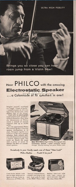 1954 Philco 1955 High Fidelity Phonograph Electrostatic Speaker Violinist Ad