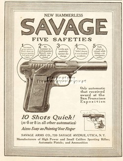 1915 Savage Automatic Pistol Utica NY Five Safeties 10 Shots Quick Original Ad