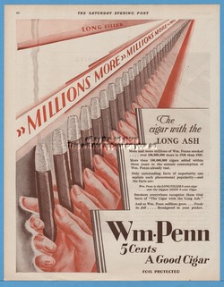 1929 Wm Penn Cigar with the long ash 5 cents box vintage smoking illustrated ad