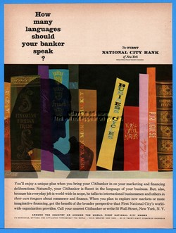 1960 First National City Bank New York Banker Heads Books How Many Languages Ad