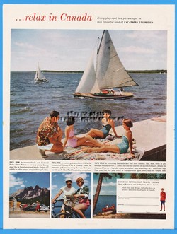 1953 Canadian Government Travel Bureau Beach Sailboat Mountie Natl Park Print Ad