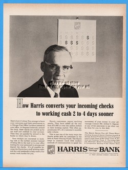 1963 Harris Trust & Savings Bank Check Clearing 2 to 4 Days Sooner Print Ad