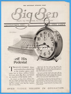 1915 Big Ben Alarm Clock Westclox LaSalle IL Off His Pedestal Art January 23 Ad