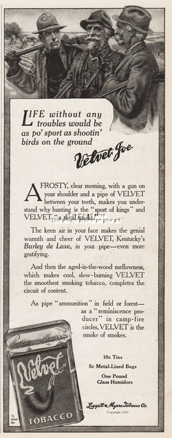 1915 Velvet Joe Pipe Tobacco Liggett & Myers TIn Hunting Burley de Luxe Art Ad