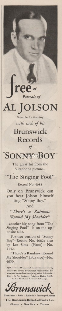 1929 Brunswick Phonograph Records Ad Al Jolson Photo Sonny Boy Singing Fool