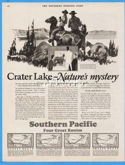 1929 Crater Lake Oregon Natures Mystery Cowboy Art Southern Pacific Railroad Ad