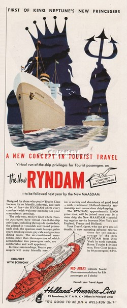1951 Holland America Line MS Ryndam Ocean Liner Cruise Ship Tourist Class Ad