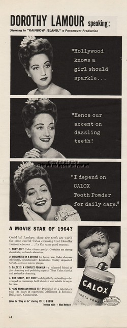 1944 Dorothy Lamour Rainbow Island Movie Calox Tooth Powder Bridgeport CT Ad