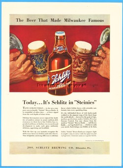1937 Schlitz Brewery Ad Milwaukee WI Beer Steins Steinies Brown Bottles Art