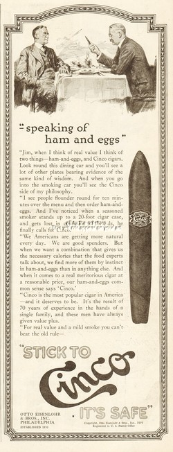 1921 Otto Eisenlohr & Bros Cigar Store Philadelphia Ham and Eggs Dining Car Ad