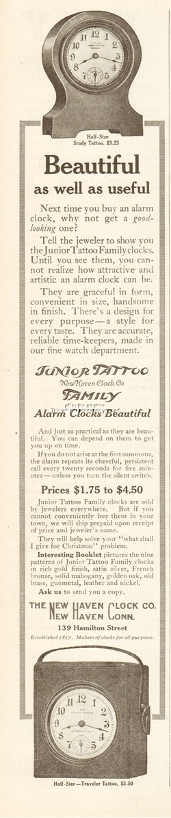 1912 New Haven Clock Co CT Study Traveler Junior Tattoo Alarm Beautiful Ad
