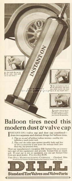 1925 Dill Mfg. Co Cleveland Ohio Balloon Tire Valve Stem Parts Instant On Cap Ad