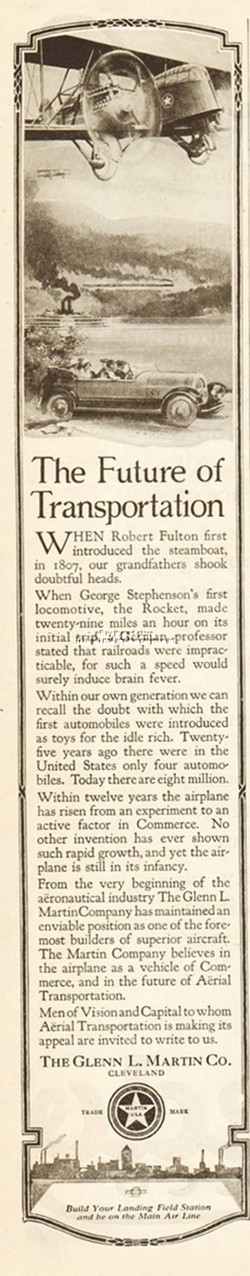 1921 Glenn Martin Bomber Airplane Biplane Future of Transportation Cleveland Ad