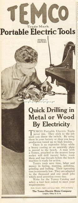 1919 Temco Electric Motor Co Leipsic Ohio Print Ad: Portable Drill Vintage Tool