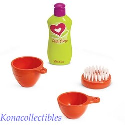 - A bottle of pretend dish soap, a kitchen towel, and a scrub brush for clean-up time