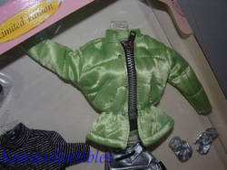 It's been an exciting day on the slopes! Barbie, toasty warm in her quilted lime greeen satin ski parka and silver-tone mittens takes one last run on the mountain and heads for the ski lodge. Barbie is apres ski chic in her black and silvery sweater with black ski leggings, neatly tucked into her matching black ski boots. She tosses her reflective ski goggles into her knap-sack and heads for the lodge.