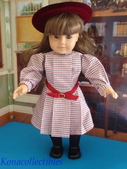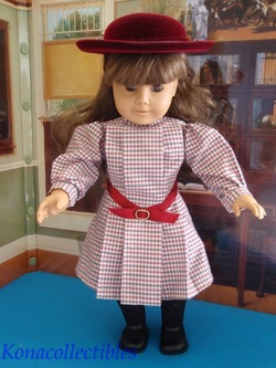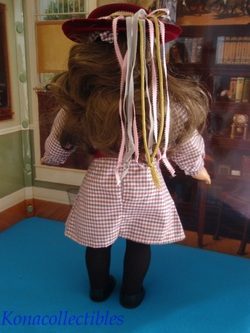 Samantha wears her original Meet Outfit which is complete with dress, black tights, maryjane shoes and white bloomers. She also comes with her HAT from her accessory set, but no other accessories. These older hats are beautiful velveteen with ribbons and gold rope accents. She has a Pleasant Company backstamp and artist mark behind her right ear.
