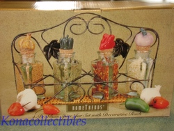 Too FUN! Great spice rack with metal frame. Comes with 4 glass jars topped with cork caps that are decorated with resin tops of Chili, Garlic, Onion, Bell Pepper. I'm calling this used because box is a little worn but it looks like it has never been used.