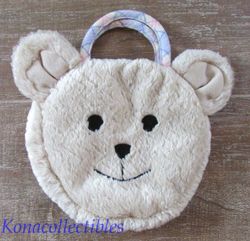 Made of soft beige faux fur with embroidered face and plaid lining and handle. There is a small Velcro tab for closing. The eyes, nose, and mouth are embroidered so it is safe for your little one. The handles and lining are in the Bitty Bear signature plaid. A great gift for that for that Bitty Baby fan in your life! Child sized for your little one. Embroidered faux-fur purse has plaid lining & handle, velcro closure, & is approx. 8" tall.