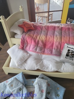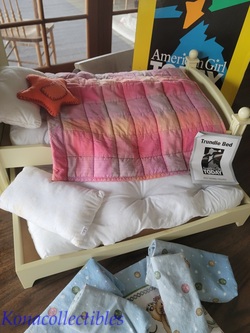 It has a headboard, footboard and mattress holder. You will receive (2) Two mattress pads and 2 pillows. This trundle bed set is so rare and hard to find. You will be a certain hit with this fantastic present! What's even more rare is that it comes in its original American Girl box and it's the really old one with yellow and black! Remember that one?!! This set is USED but in great condition. You will also receive the Plaid Quilt and Star Pillow that is long retired. But also you will receive a homemade quilt with cute bears, with matching homemade mattress covers and 2 pillow case covers. Yellow Flower Armoire is NOT included. But I do have it in my store. Please check it out!