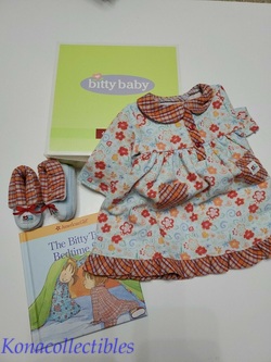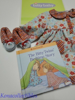 Soft, comfy, warm and very sweet! That's how to describe this wonderful Crazy Daisy nightie from American Girl. It is long retired and pretty hard to find as it was from 2007. 2007 American Girl Bitty Twins retired girl twin Crazy Daisy Nightie Set includes the adorable soft flannel floral print nightgown and sweet soft bootie slippers and Bedtime Stories hardback book. It is NEW, in original American Girl Bitty Baby box.