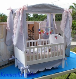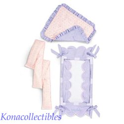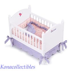 Crib set with Pink Heart that twirls in the headboard. Comes with mattress pad. New in original American Girl Box. Baby's Bedding SetItem #BCRB Comes complete with pink quilt with pink, yellow and lavender hearts, bumper pads and lavender crib skirt with Bitty Baby embroidered at the base. Crib Canopy