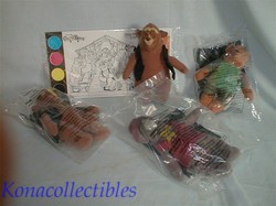 From the Classic Hit "THE COUNTRY BEARS" are McDonald�s Happy Meal toys Mint and still in the package. You will receive Beary, Barrinson #1, Henry #4 and Tennessee O�Neal #5 along with Blast Off promotion all sealed in the packaging. You will also receive another Tennessee O�Neal without the packaging. Each has a rubbery face and soft stuffed body. Disney toys are always well sought after and highly collectible. Complete your collection or start now! You�re sure to get a kick out of these charming bears.