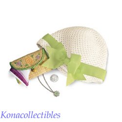 Kit�s crocheted hat is called a cloche, which is the French word for bell. Her straw purse holds a printed hankie and a reproduction buffalo nickel. Her necklace is styled after a compass inside a ship�s wheel�to remind her that she has to find her own way through hard times!