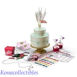 Personalize your doll-size party just the way you want it! Set the birthday cake on the cake stand, then set out the place cards, cupcakes, and blowouts. Use the three packets of removable stickers (numbers, gems, butterflies and flowers) to decorate everything, including the special gift box that holds a butterfly necklace for you. Also includes special confetti that says �Happy Birthday.� The set is new, never been played with and comes in original American Girl box for easy gift giving.
